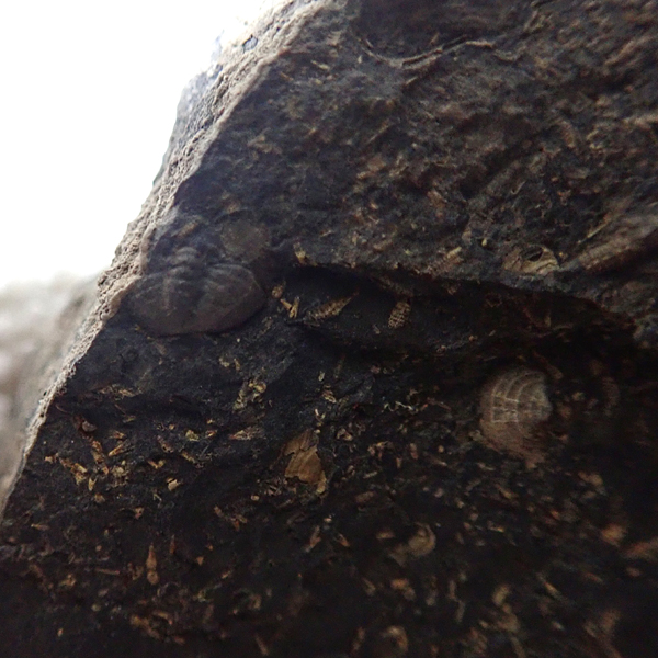 Napravo od pygidia je drobný brachiopod Dalejodiscus sp.